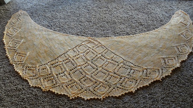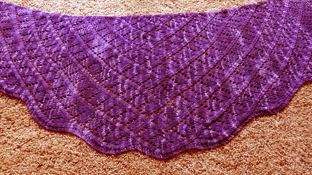 This is the Orchard Shawl. I bought this beautiful kettle dyed yarn on vacation in Lancaster, PA a couple years ago and I lost the ball band so I can't tell you more about it. I do remember that it's Merino. Beautiful color!