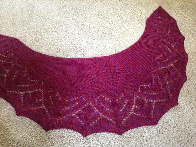 And the last one in the series is the Border Garden Shawl. I had a little trouble getting the color right in the photographs on this one. It's a beautiful deep red-burgundy color with a hit of purple. The yarn is hand-dyed by Abstract Fiber and is their Merino Silk in the Cosmopolitan colorway. It has a beautiful drape.