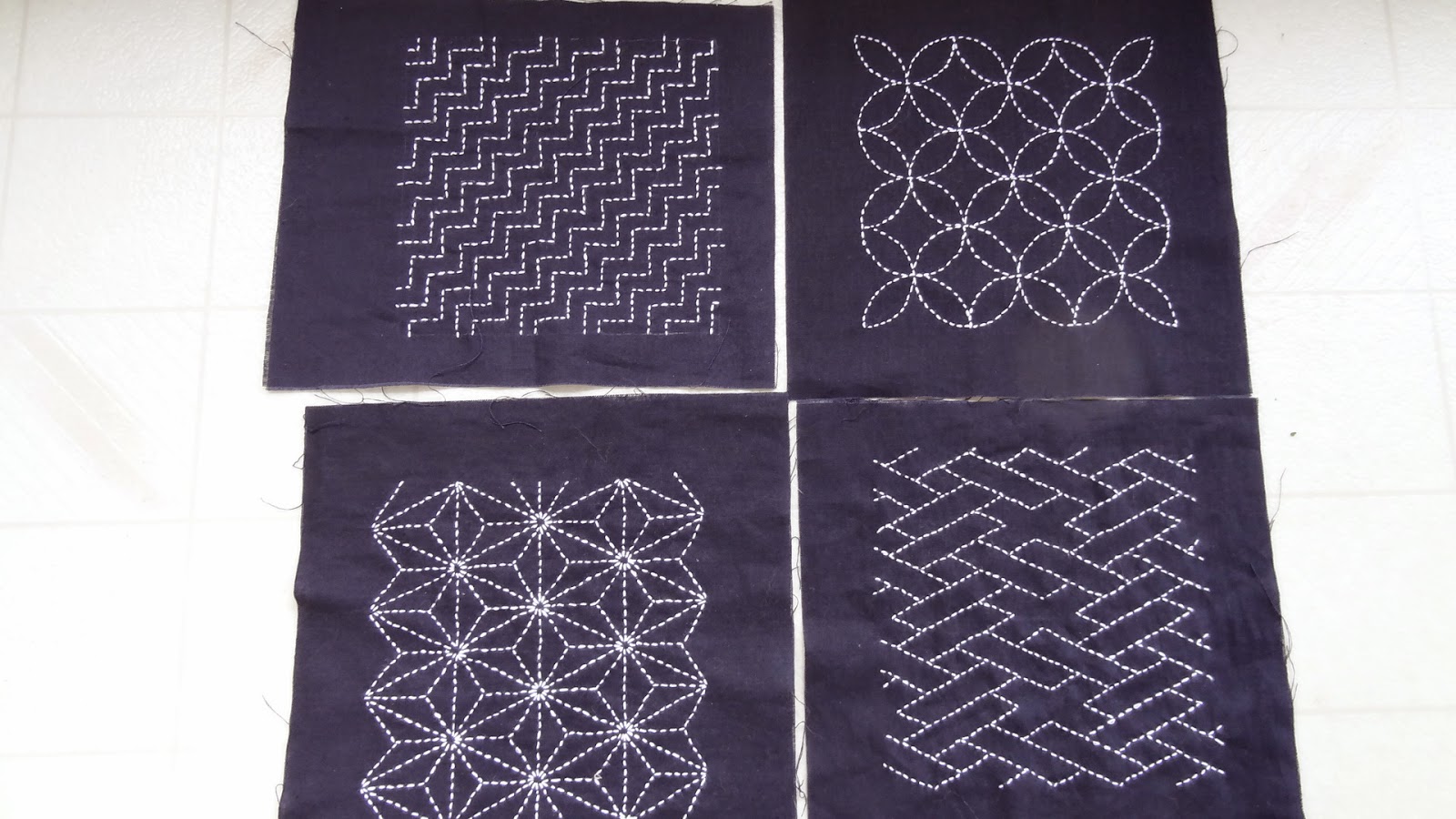 The next project will take a little longer. It's a quilt with 16 sashiko background blocks and 9 blocks that combine hand applique flowers with sashiko stems and leaves. I'm starting with the 16 background blocks. Here are the first 4: